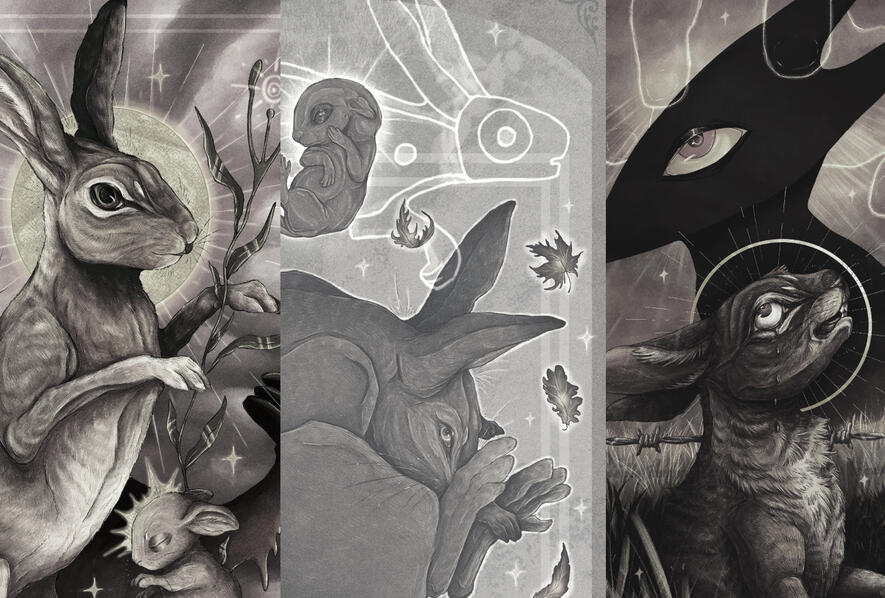 River Biggs is a multidisciplinary artist living in Upstate NY whose work depicts nature and the beings that inhabit it. He prefers to have animals as the center of his artwork, depicting their anatomical uniqueness and spirit. River has a closeness with native animals that he encounters outside every day, and has an interest in drawing them. Nature is the driving force for him, and is always what is on the forefront of his mind when creating artwork. River enjoys creating what seems to be a scene frozen in time, with specific elements such as arches and various shapes. He enjoys combining the contrast of simplicity and realism. And yes, he is very connected to rabbits.