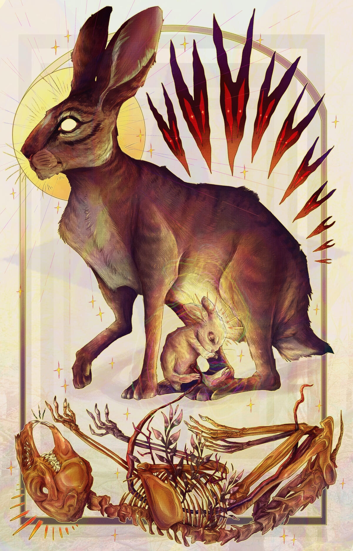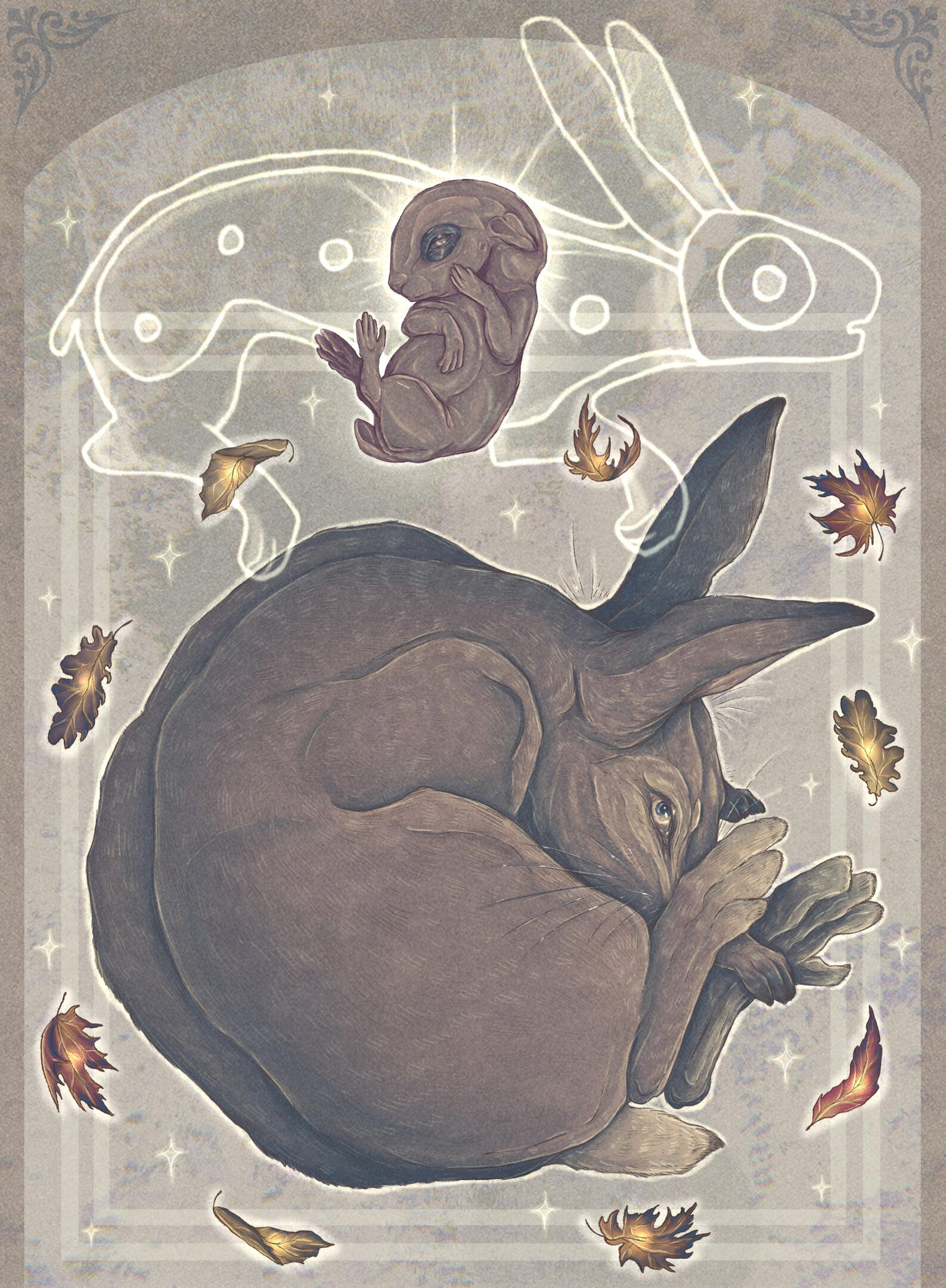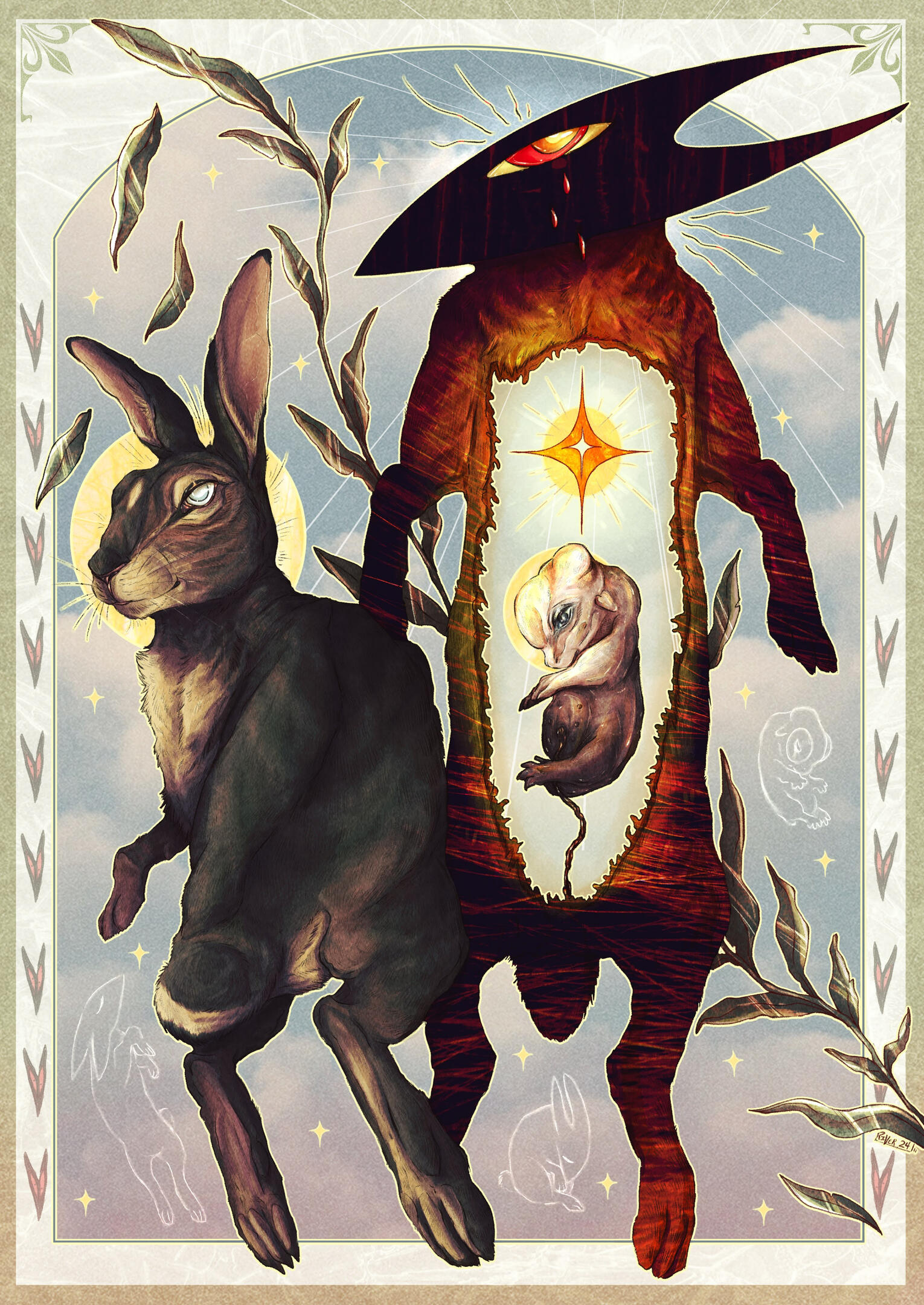 River Biggs is a multidisciplinary artist living in Upstate NY whose work depicts nature and the beings that inhabit it. He prefers to have animals as the center of his artwork, depicting their anatomical uniqueness and spirit. River has a closeness with native animals that he encounters outside every day, and has an interest in drawing them. Nature is the driving force for him, and is always what is on the forefront of his mind when creating artwork. River enjoys creating what seems to be a scene frozen in time, with specific elements such as arches and various shapes. He enjoys combining the contrast of simplicity and realism. And yes, he is very connected to rabbits.